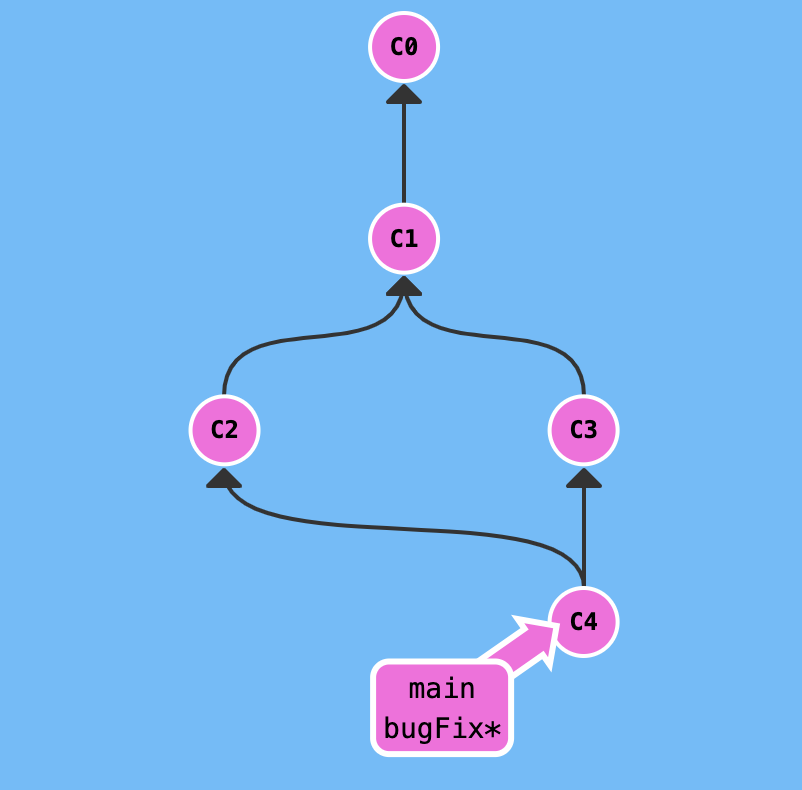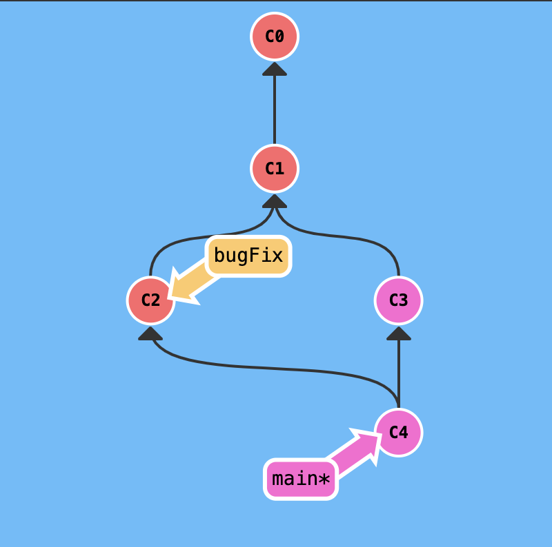 새로운 브랜치가 생길 것 같지만, bugFix가 main의 부모 쪽에 있었기 때문에 간단히 bugFix를 main이 붙어 있는 커밋으로 이동시키기만 한다.