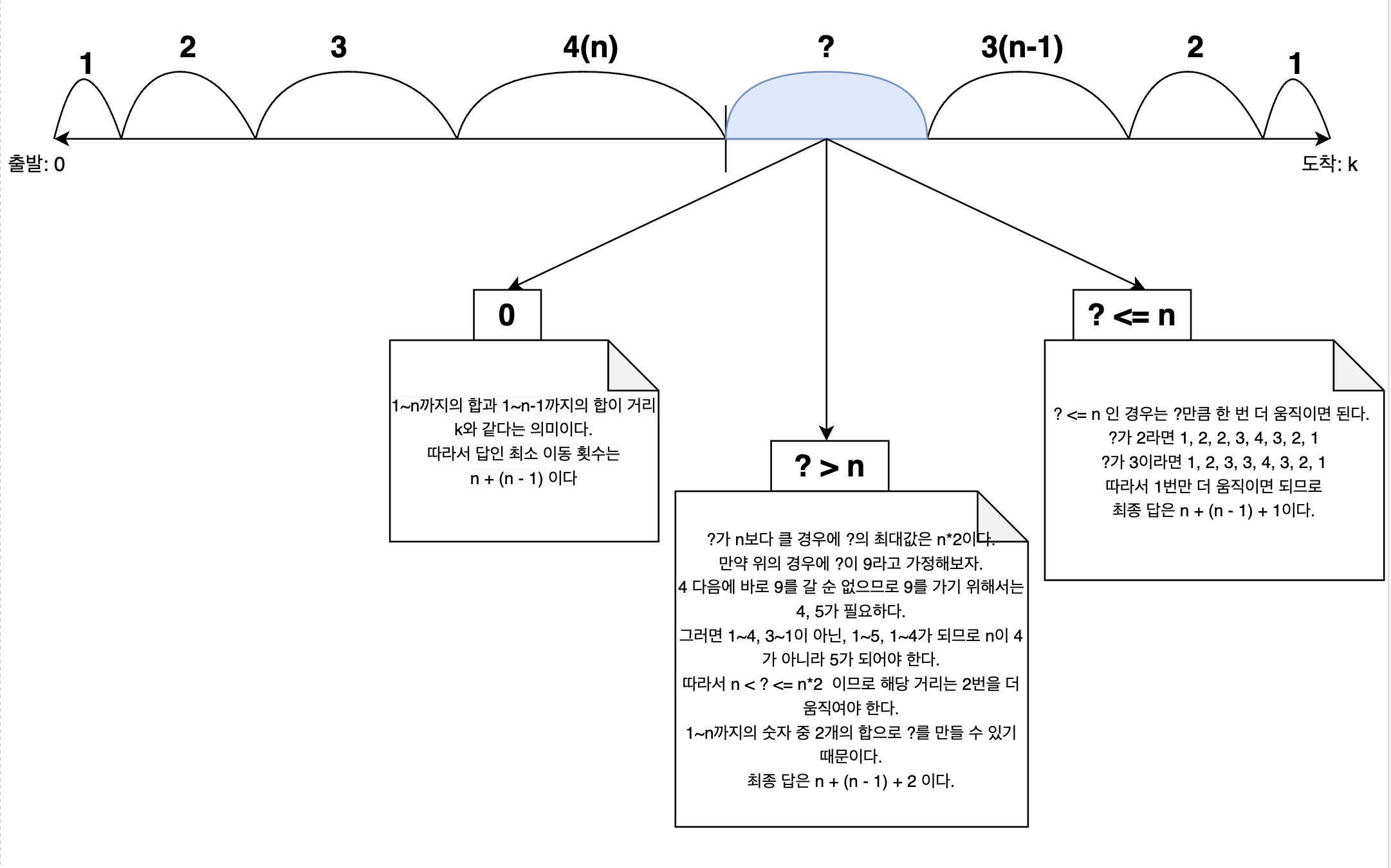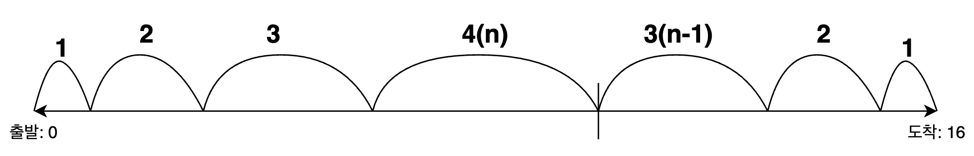 그래서 다시 한번 생각해보다가 하나의 규칙을 발견하게 됐다. 바로 이동 규칙 1번과 2번에 의해 최종 이동거리는 1, 2, 3, …, n, n-1, n-2, …, 3, 2, 1과 같은 형태가 되어야만 한다는 것이다.